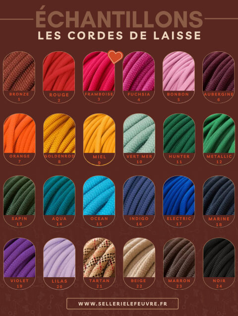 La laisse Glaz en cuir et corde colorée est l’accessoire parfait pour allier style et confort lors de vos sorties avec votre chien. Confectionnée en cuir français au tannage végétal et agrémentée d’une corde ronde colorée de 10 mm de diamètre, cette laisse vous garantit à la fois robustesse, souplesse et une touche d’originalité. Retrouvez les différents coloris de corde sur la planche d’échantillon, à la suite des photos de la laisse pour vous aider à faire votre choix.