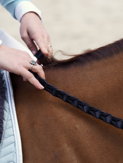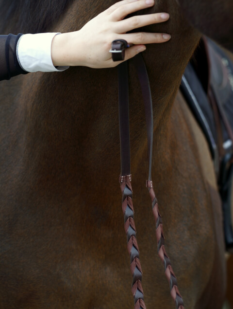 Tressage traditionnel « Bredies » : Cette technique historique, autrefois utilisée par les maîtres selliers, assure un excellent maintien en main et une solidité accrue. Le tressage est le précurseur de la rêne grip en caoutchouc, offrant une adhérence naturelle et une prise en main fiable.